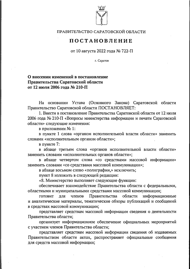 Постановление Правительства Саратовской области от 10.08.2022 N 722-П "О внесении изменений в постановление Правительства Саратовской области от 12 июля 2006 года N 210-П"