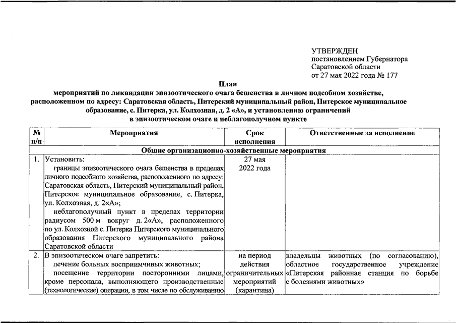 Постановление Губернатора Саратовской области от 27.05.2022 N 177 "Об установлении карантина по заболеванию бешенством животных на территории радиусом 500 м вокруг д. 2 "А", расположенного по ул. Колхозной с. Питерка Питерского муниципального образования Питерского муниципального района Саратовской области" (вместе с "Планом мероприятий по ликвидации эпизоотического очага бешенства в личном подсобном хозяйстве, расположенном по адресу: Саратовская область, Питерский муниципальный район, Питерское муниципальное образование, с. Питерка, ул. Колхозная, д. 2 "А", и установлению ограничений в эпизоотическом очаге и неблагополучном пункте")