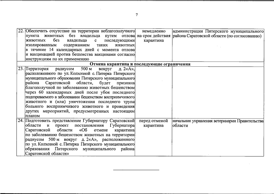 Постановление Губернатора Саратовской области от 27.05.2022 N 177 "Об установлении карантина по заболеванию бешенством животных на территории радиусом 500 м вокруг д. 2 "А", расположенного по ул. Колхозной с. Питерка Питерского муниципального образования Питерского муниципального района Саратовской области" (вместе с "Планом мероприятий по ликвидации эпизоотического очага бешенства в личном подсобном хозяйстве, расположенном по адресу: Саратовская область, Питерский муниципальный район, Питерское муниципальное образование, с. Питерка, ул. Колхозная, д. 2 "А", и установлению ограничений в эпизоотическом очаге и неблагополучном пункте")