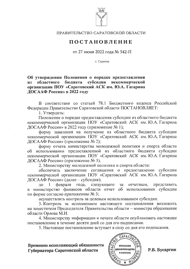 Постановление Правительства Саратовской области от 27.06.2022 N 542-П "Об утверждении Положения о порядке предоставления из областного бюджета субсидии некоммерческой организации ПОУ "Саратовский АСК им. Ю.А. Гагарина ДОСААФ России" в 2022 году"