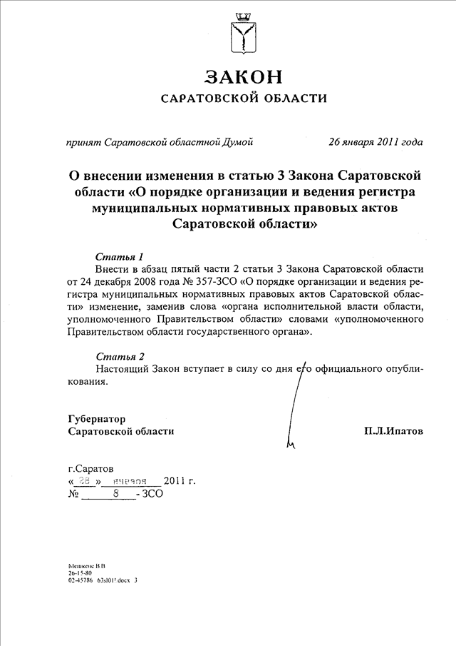 Закон Саратовской области от 28.01.2011 N 8-ЗСО "О внесении изменения в статью 3 Закона Саратовской области "О порядке организации и ведения регистра муниципальных нормативных правовых актов Саратовской области"