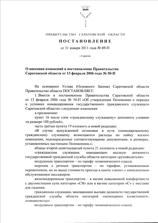 Постановление Правительства Саратовской области от 31.01.2011 N 69-П "О внесении изменений в постановление Правительства Саратовской области от 13 февраля 2006 г. N 50-П"