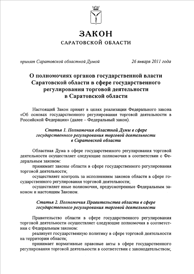 Закон Саратовской области от 28.01.2011 N 5-ЗСО "О полномочиях органов государственной власти Саратовской области в сфере государственного регулирования торговой деятельности в Саратовской области"