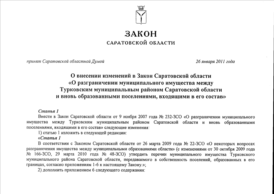 Закон Саратовской области от 28.01.2011 N 4-ЗСО "О внесении изменений в Закон Саратовской области "О разграничении муниципального имущества между Турковским муниципальным районом Саратовской области и вновь образованными поселениями, входящими в его состав"