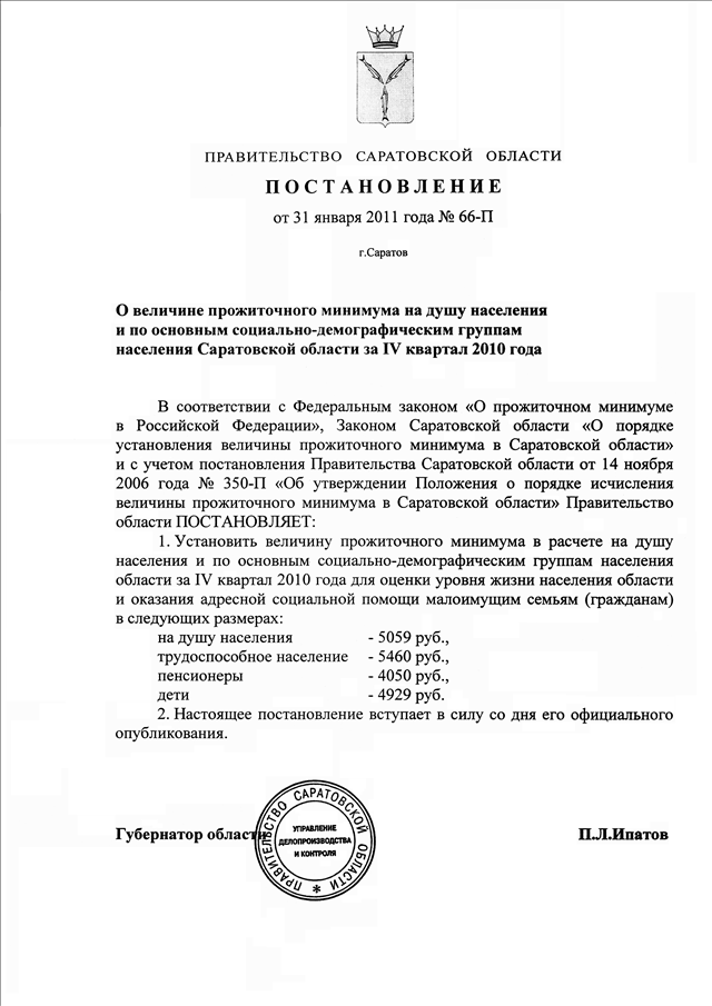 Постановление Правительства Саратовской области от 31.01.2011 N 66-П "О величине прожиточного минимума на душу населения и по основным социально-демографическим группам населения Саратовской области за IV квартал 2010 года"