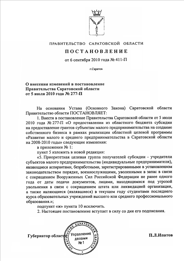 Постановление Правительства Саратовской области от 06.09.2010 N 411-П "О внесении изменений в постановление Правительства Саратовской области от 5 июля 2010 г. N 277-П"