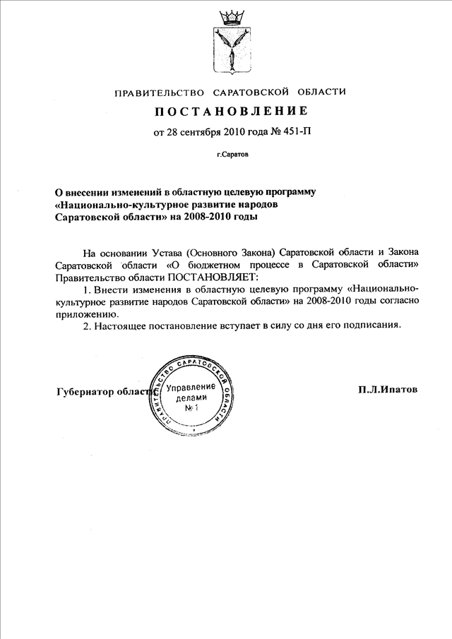 Постановление Правительства Саратовской области от 28.09.2010 N 451-П "О внесении изменений в областную целевую программу "Национально-культурное развитие народов Саратовской области" на 2008 - 2010 годы"