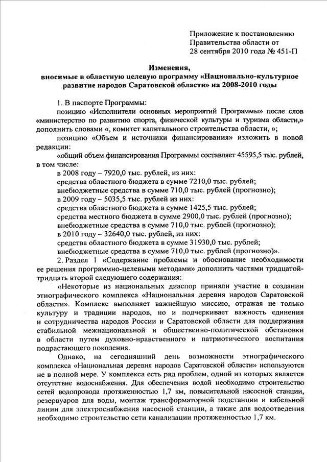 Постановление Правительства Саратовской области от 28.09.2010 N 451-П "О внесении изменений в областную целевую программу "Национально-культурное развитие народов Саратовской области" на 2008 - 2010 годы"
