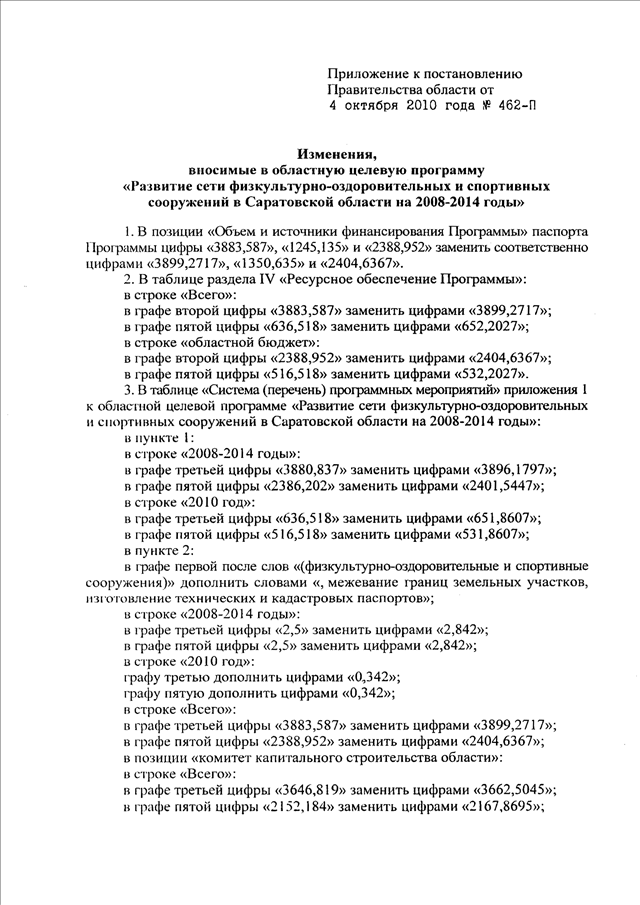 Постановление Правительства Саратовской области от 04.10.2010 N 462-П "О внесении изменений в областную целевую программу "Развитие сети физкультурно-оздоровительных и спортивных сооружений в Саратовской области на 2008 - 2014 годы"