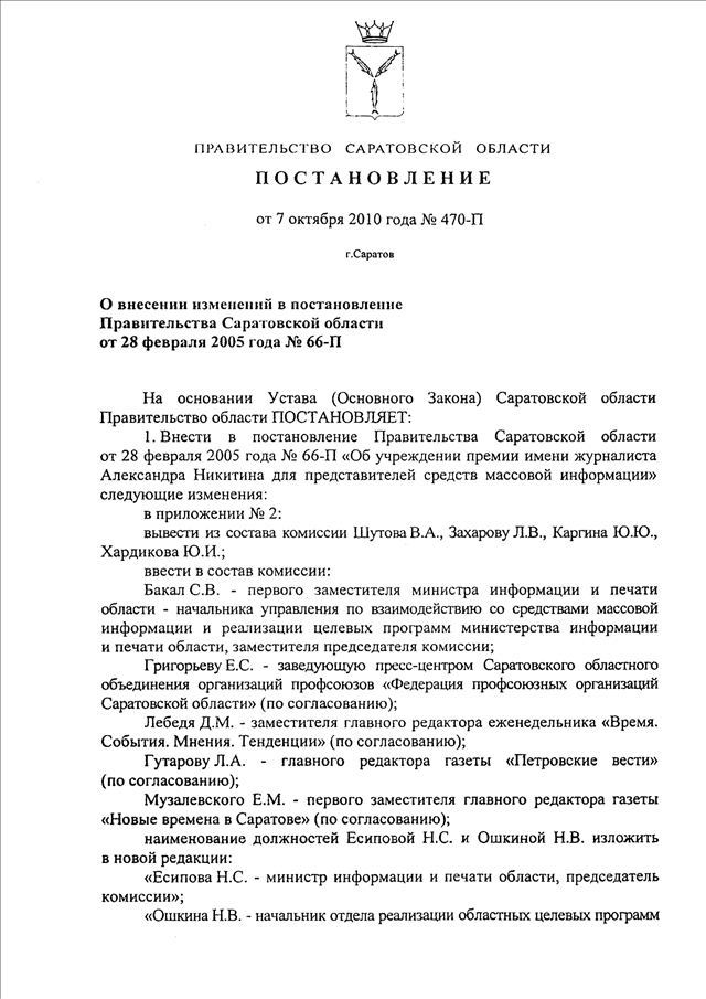 Постановление Правительства Саратовской области от 07.10.2010 N 470-П "О внесении изменений в постановление Правительства Саратовской области от 28 февраля 2005 г. N 66-П"
