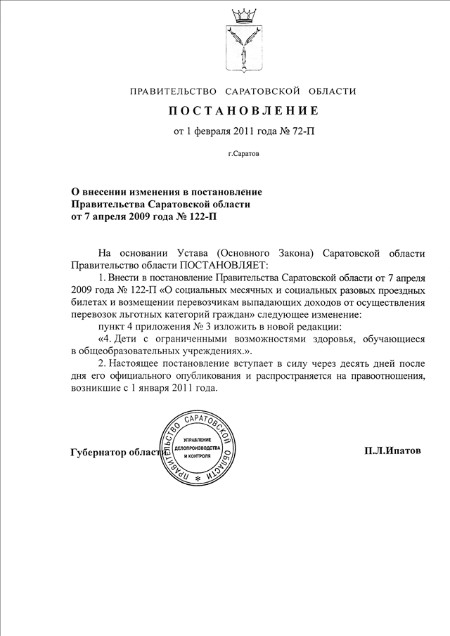 Постановление Правительства Саратовской области от 01.02.2011 N 72-П "О внесении изменения в постановление Правительства Саратовской области от 7 апреля 2009 г. N 122-П"