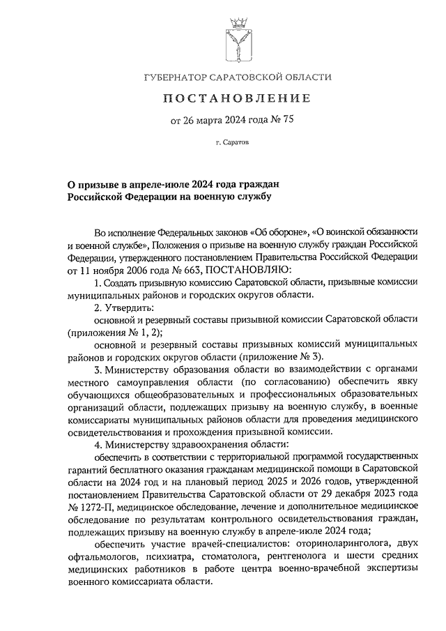Постановление Губернатора Саратовской области от 26.03.2024 N 75 "О призыве в апреле - июле 2024 года граждан Российской Федерации на военную службу"