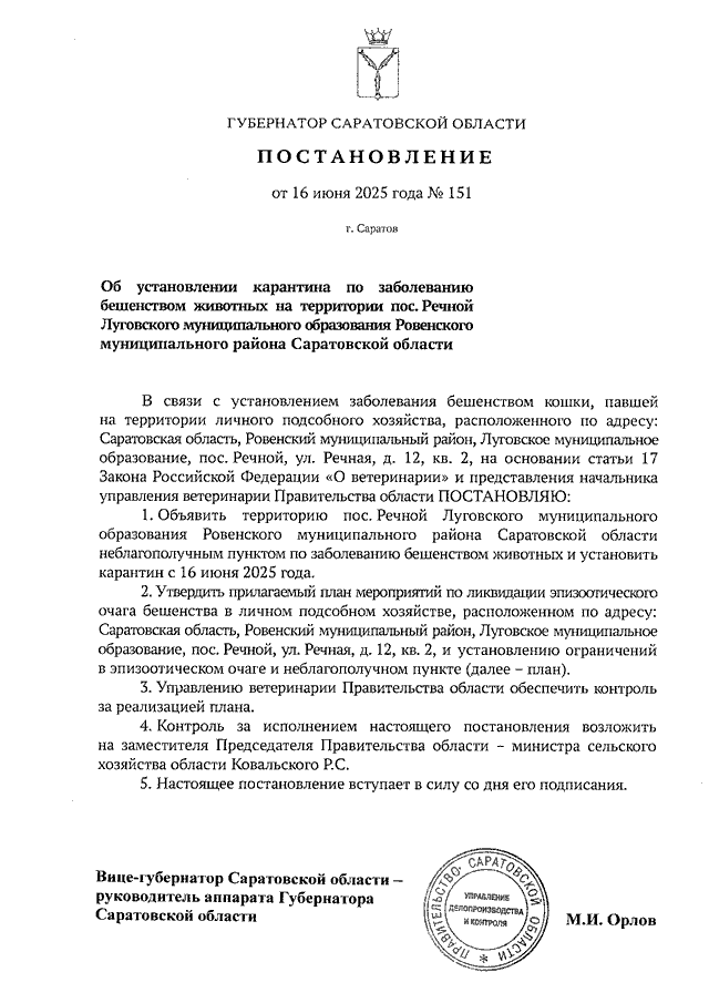 Постановление Губернатора Саратовской области от 16.06.2025 N 151 "Об установлении карантина по заболеванию бешенством животных на территории пос. Речной Луговского муниципального образования Ровенского муниципального района Саратовской области"