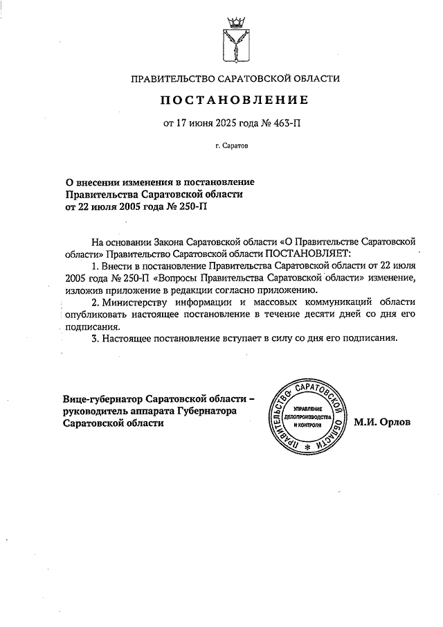 Постановление Правительства Саратовской области от 17.06.2025 N 463-П "О внесении изменения в постановление Правительства Саратовской области от 22 июля 2005 года N 250-П"