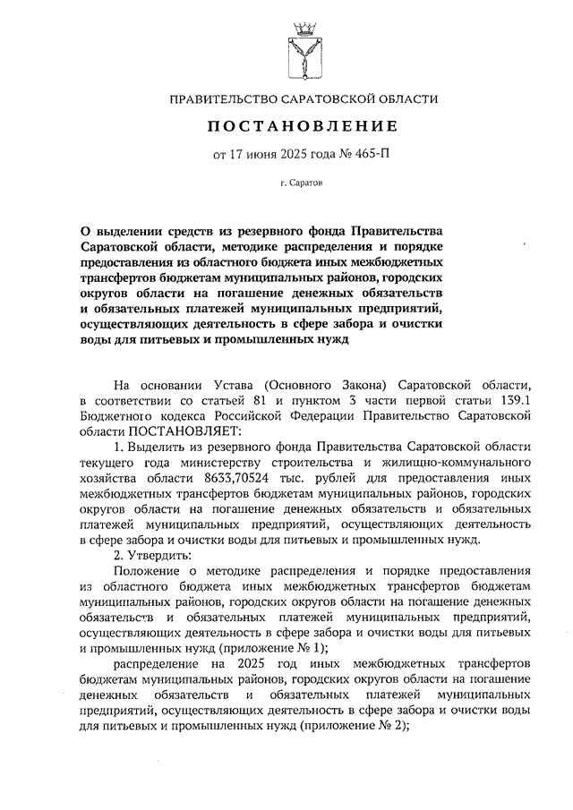 Постановление Правительства Саратовской области от 17.06.2025 N 465-П "О выделении средств из резервного фонда Правительства Саратовской области, методике распределения и порядке предоставления из областного бюджета иных межбюджетных трансфертов бюджетам муниципальных районов, городских округов области на погашение денежных обязательств и обязательных платежей муниципальных предприятий, осуществляющих деятельность в сфере забора и очистки воды для питьевых и промышленных нужд" (вместе с "Положением о методике распределения и порядке предоставления из областного бюджета иных межбюджетных трансфертов бюджетам муниципальных районов, городских округов области на погашение денежных обязательств и обязательных платежей муниципальных предприятий, осуществляющих деятельность в сфере забора и очистки воды для питьевых и промышленных нужд")