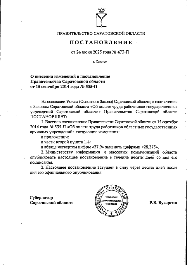 Постановление Правительства Саратовской области от 24.06.2025 N 473-П "О внесении изменений в постановление Правительства Саратовской области от 15 сентября 2014 года N 535-П"
