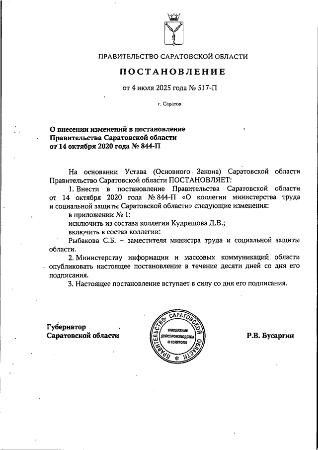 Постановление Правительства Саратовской области от 04.07.2025 N 517-П "О внесении изменений в постановление Правительства Саратовской области от 14 октября 2020 года N 844-П"