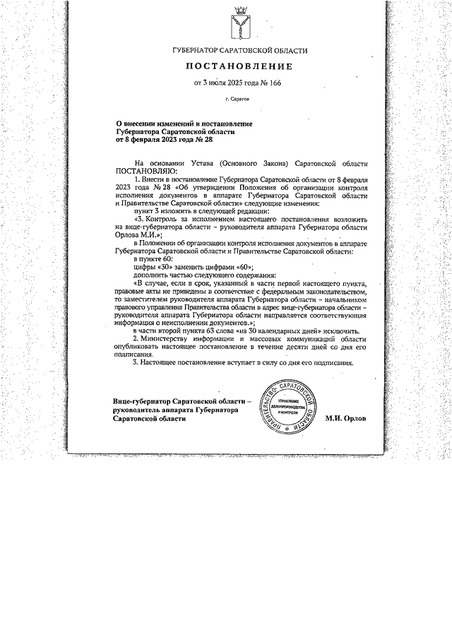 Постановление Губернатора Саратовской области от 03.07.2025 N 166 "О внесении изменений в постановление Губернатора Саратовской области от 8 февраля 2023 года N 28"