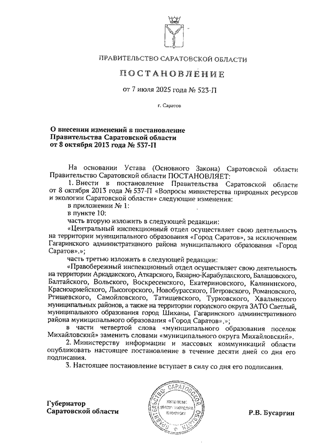 Постановление Правительства Саратовской области от 07.07.2025 N 523-П "О внесении изменений в постановление Правительства Саратовской области от 8 октября 2013 года N 537-П"