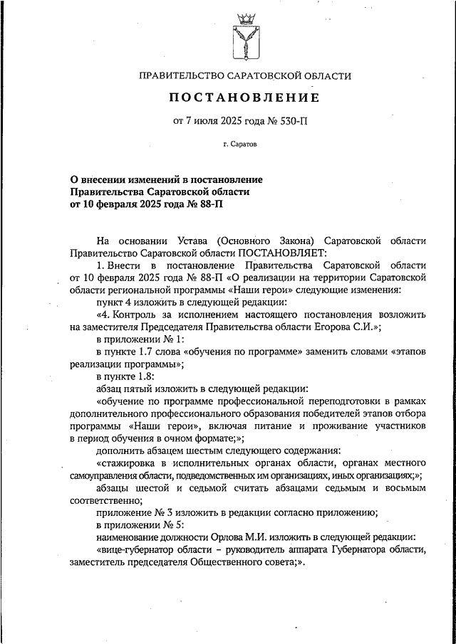 Постановление Правительства Саратовской области от 07.07.2025 N 530-П "О внесении изменений в постановление Правительства Саратовской области от 10 февраля 2025 года N 88-П"