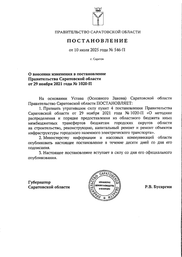 Постановление Правительства Саратовской области от 10.07.2025 N 546-П "О внесении изменения в постановление Правительства Саратовской области от 29 ноября 2021 года N 1020-П"