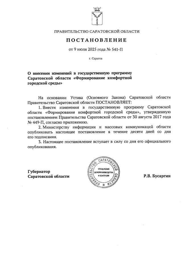 Постановление Правительства Саратовской области от 09.07.2025 N 541-П "О внесении изменений в государственную программу Саратовской области "Формирование комфортной городской среды"