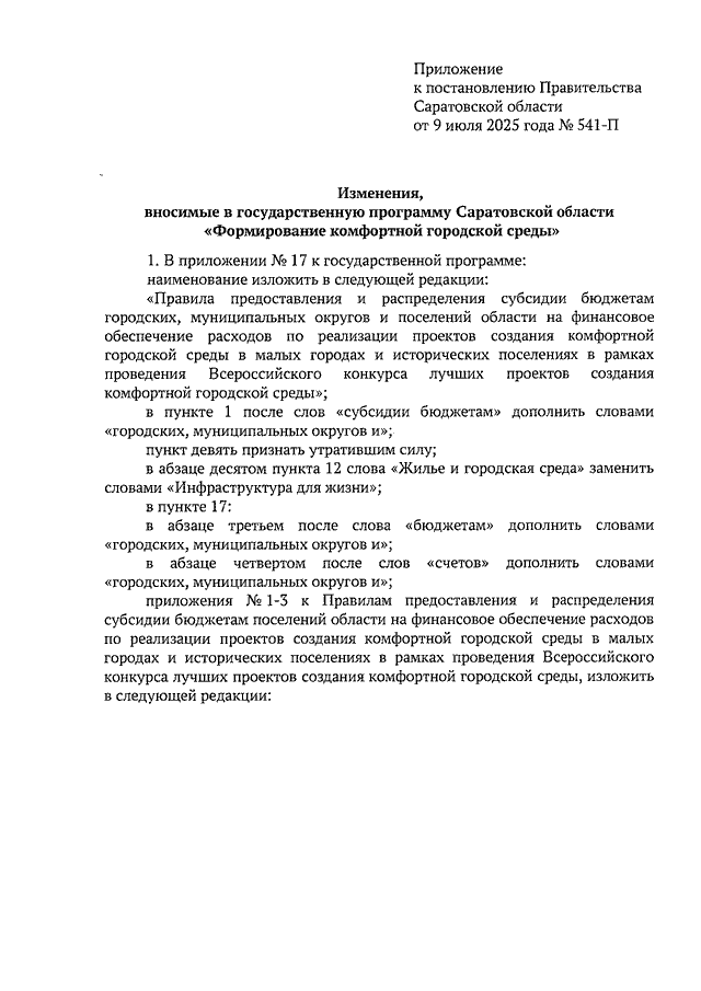 Постановление Правительства Саратовской области от 09.07.2025 N 541-П "О внесении изменений в государственную программу Саратовской области "Формирование комфортной городской среды"