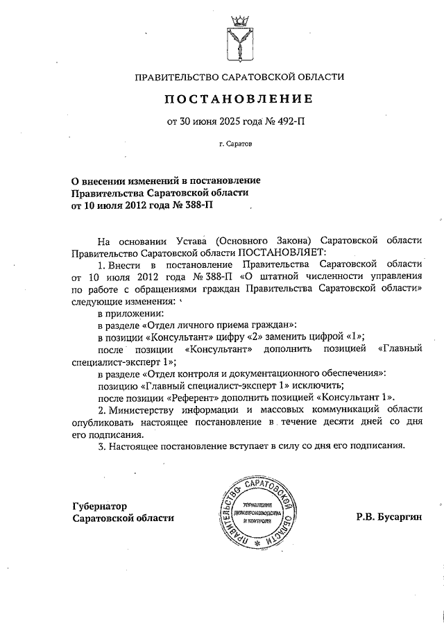 Постановление Правительства Саратовской области от 30.06.2025 N 492-П "О внесении изменений в постановление Правительства Саратовской области от 10 июля 2012 года N 388-П"