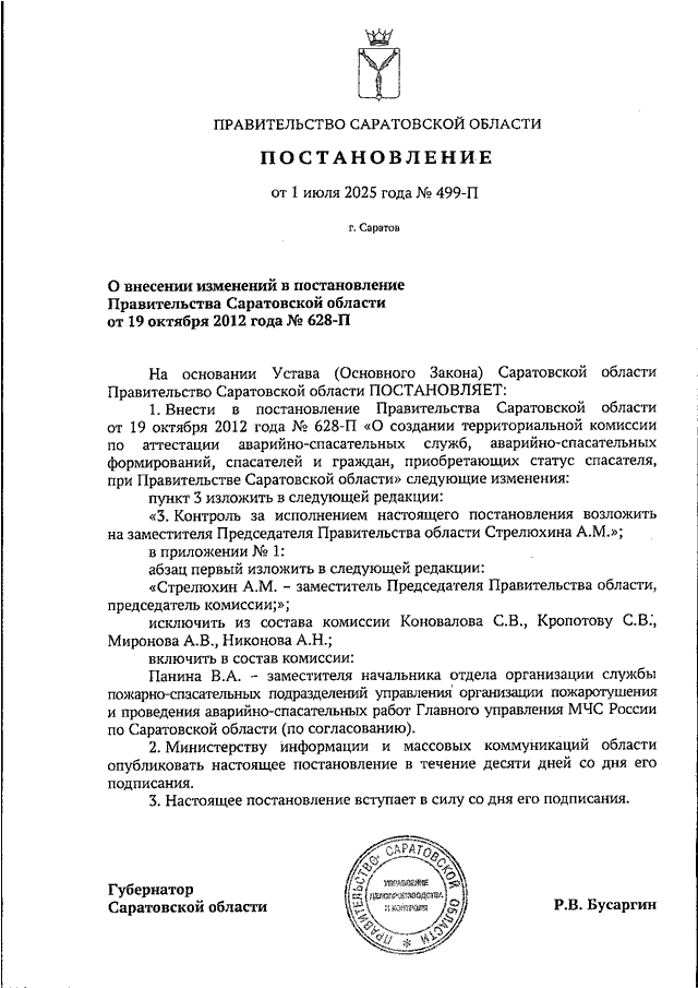 Постановление Правительства Саратовской области от 01.07.2025 N 499-П "О внесении изменений в постановление Правительства Саратовской области от 19 октября 2012 года N 628-П"