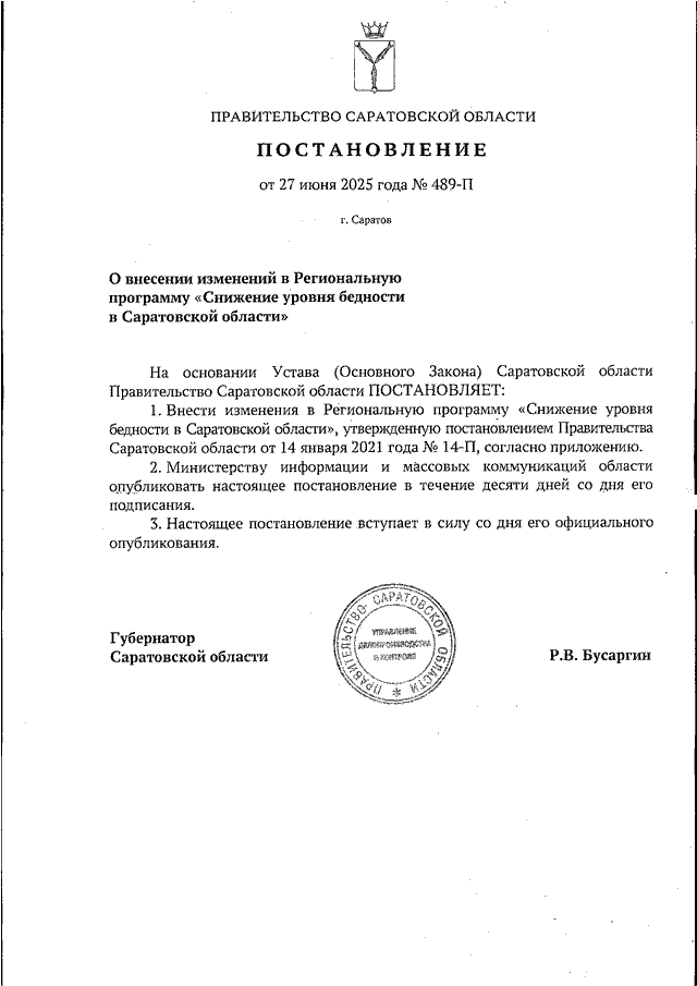 Постановление Правительства Саратовской области от 27.06.2025 N 489-П "О внесении изменений в Региональную программу "Снижение уровня бедности в Саратовской области"