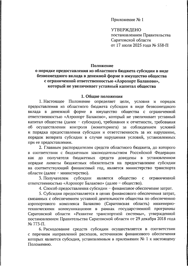 Постановление Правительства Саратовской области от 17.07.2025 N 558-П "Об утверждении Положения о порядке предоставления из областного бюджета субсидии в виде безвозмездного вклада в денежной форме в имущество общества с ограниченной ответственностью "Аэропорт Балаково", который не увеличивает уставный капитал общества"