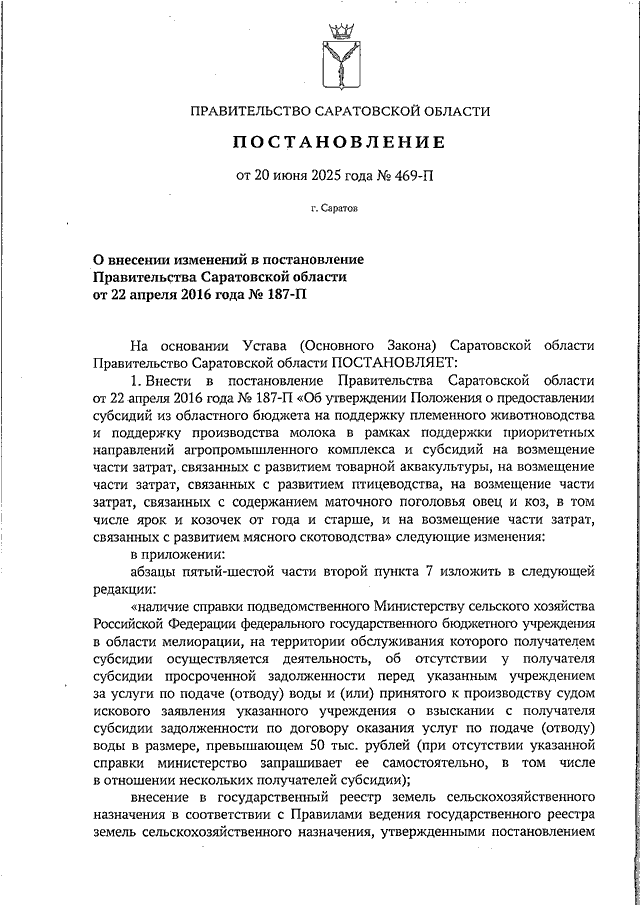 Постановление Правительства Саратовской области от 20.06.2025 N 469-П "О внесении изменений в постановление Правительства Саратовской области от 22 апреля 2016 года N 187-П"