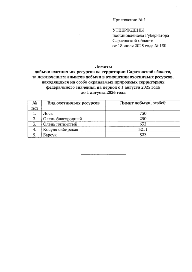 Постановление Губернатора Саратовской области от 18.07.2025 N 180 "Об утверждении лимитов и квот добычи охотничьих ресурсов на территории Саратовской области, за исключением лимитов и квот добычи в отношении охотничьих ресурсов, находящихся на особо охраняемых природных территориях федерального значения, на период с 1 августа 2025 года до 1 августа 2026 года"