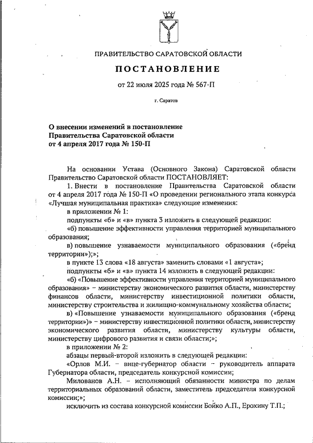 Постановление Правительства Саратовской области от 22.07.2025 N 567-П "О внесении изменений в постановление Правительства Саратовской области от 4 апреля 2017 года N 150-П"