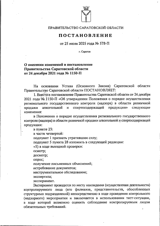 Постановление Правительства Саратовской области от 25.07.2025 N 578-П "О внесении изменений в постановление Правительства Саратовской области от 24 декабря 2021 года N 1150-П"