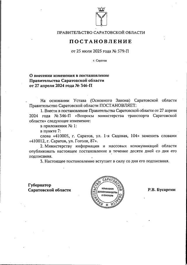 Постановление Правительства Саратовской области от 25.07.2025 N 579-П "О внесении изменения в постановление Правительства Саратовской области от 27 апреля 2024 года N 346-П"