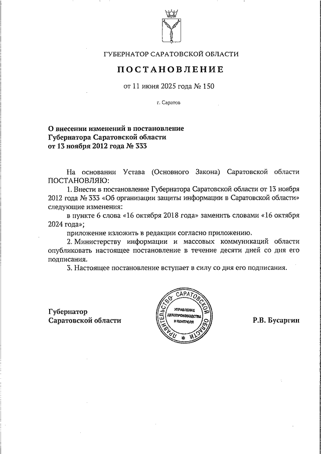 Постановление Губернатора Саратовской области от 11.06.2025 N 150 "О внесении изменений в постановление Губернатора Саратовской области от 13 ноября 2012 года N 333" (вместе с "Положением об организации защиты информации в Саратовской области")