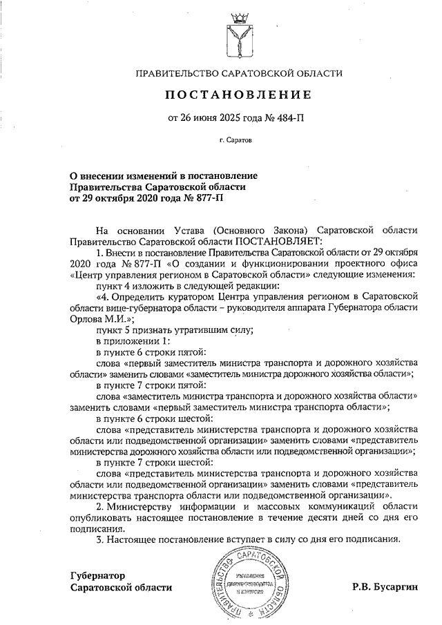 Постановление Правительства Саратовской области от 26.06.2025 N 484-П "О внесении изменений в постановление Правительства Саратовской области от 29 октября 2020 года N 877-П"
