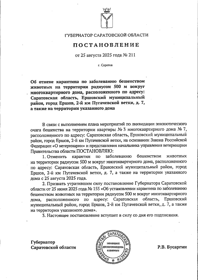 Постановление Губернатора Саратовской области от 25.08.2025 N 211 "Об отмене карантина по заболеванию бешенством животных на территории радиусом 500 м вокруг многоквартирного дома, расположенного по адресу: Саратовская область, Ершовский муниципальный район, город Ершов, 2-й км Пугачевской ветки, д. 7, а также на территории указанного дома"