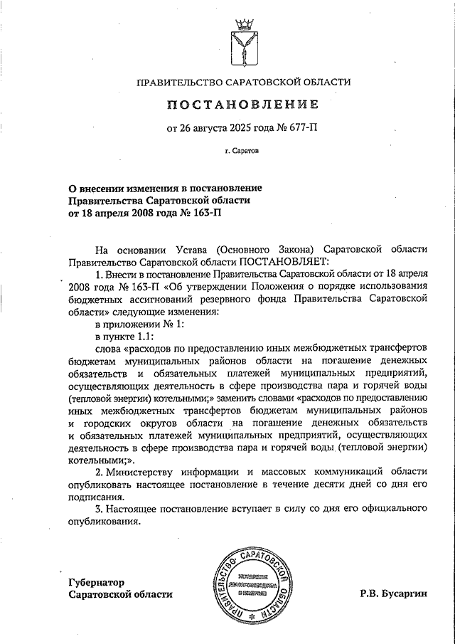Постановление Правительства Саратовской области от 26.08.2025 N 677-П "О внесении изменения в постановление Правительства Саратовской области от 18 апреля 2008 года N 163-П"
