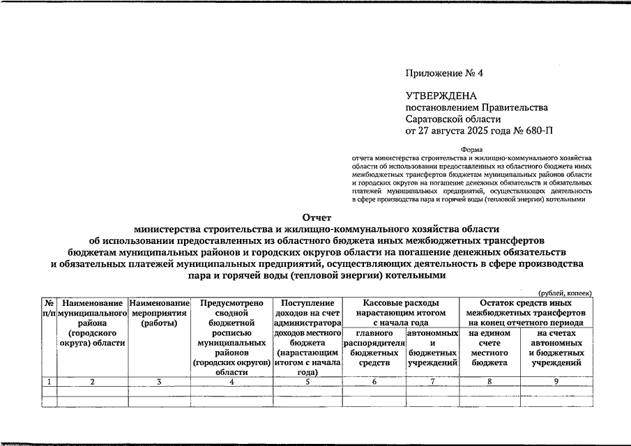 Постановление Правительства Саратовской области от 27.08.2025 N 680-П "О выделении средств из резервного фонда Правительства Саратовской области, методике распределения и порядке предоставления из областного бюджета иных межбюджетных трансфертов бюджетам муниципальных районов и городских округов области на погашение денежных обязательств и обязательных платежей муниципальных предприятий, осуществляющих деятельность в сфере производства пара и горячей воды (тепловой энергии) котельными" (вместе с "Положением о методике распределения и порядке предоставления из областного бюджета иных межбюджетных трансфертов бюджетам муниципальных районов и городских округов области на погашение денежных обязательств и обязательных платежей муниципальных предприятий, осуществляющих деятельность в сфере производства пара и горячей воды (тепловой энергии) котельными")
