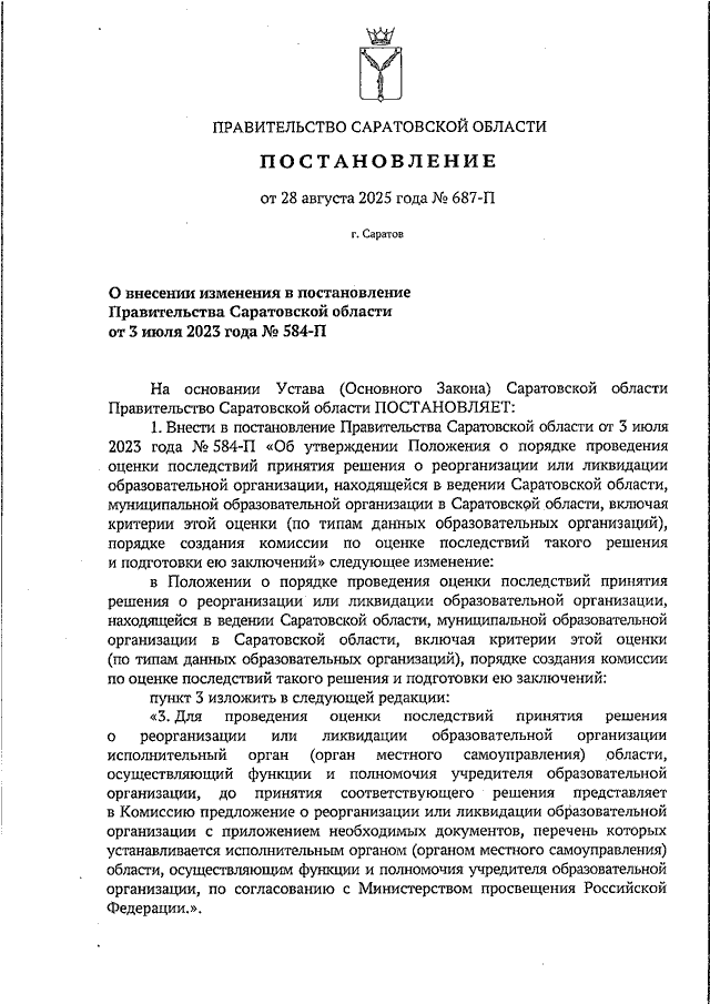 Постановление Правительства Саратовской области от 28.08.2025 N 687-П "О внесении изменения в постановление Правительства Саратовской области от 3 июля 2023 года N 584-П"