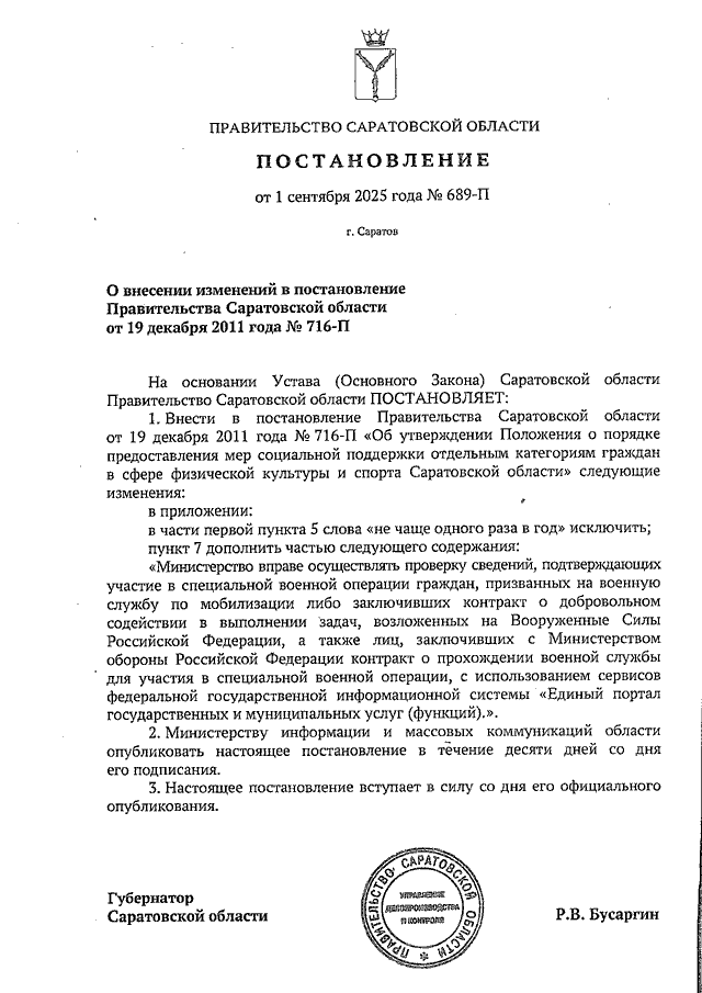 Постановление Правительства Саратовской области от 01.09.2025 N 689-П "О внесении изменений в постановление Правительства Саратовской области от 19 декабря 2011 года N 716-П"