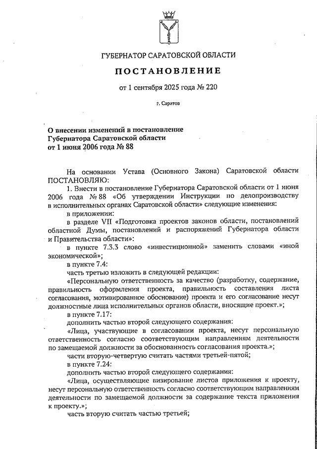 Постановление Губернатора Саратовской области от 01.09.2025 N 220 "О внесении изменений в постановление Губернатора Саратовской области от 1 июня 2006 года N 88"