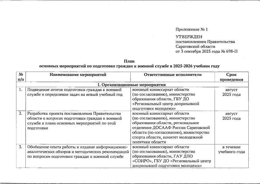 Постановление Правительства Саратовской области от 03.09.2025 N 698-П "О подготовке граждан к военной службе в 2025 - 2026 учебном году" (вместе с "Планом основных мероприятий по подготовке граждан к военной службе в 2025 - 2026 учебном году")