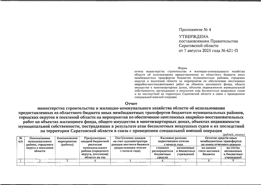 Постановление Правительства Саратовской области от 07.08.2025 N 621-П "О выделении средств из резервного фонда Правительства Саратовской области, методике распределения и порядке предоставления из областного бюджета иных межбюджетных трансфертов бюджетам муниципальных районов, городских округов и поселений области на мероприятия по обеспечению неотложных аварийно-восстановительных работ на объектах жилищного фонда, общего имущества в многоквартирных домах, объектах недвижимости муниципальной собственности, пострадавших в результате атак беспилотных воздушных судов и их последствий на территории Саратовской области в связи с проведением специальной военной операции" (вместе с "Положением о методике распределения и порядке предоставления из областного бюджета иных межбюджетных трансфертов бюджетам муниципальных районов, городских округов и поселений области на мероприятия по обеспечению неотложных аварийно-восстановительных работ на объектах жилищного фонда, общего имущества в многоквартирных домах, объектах недвижимости муниципальной собственности, пострадавших в результате атак беспилотных воздушных судов и их последствий на территории Саратовской области в связи с проведением специальной военной операции")