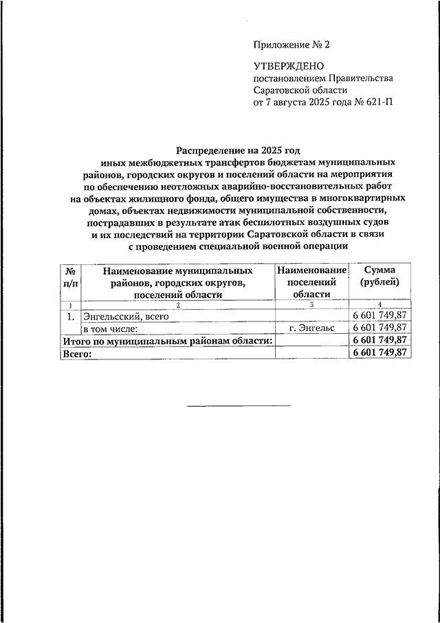 Постановление Правительства Саратовской области от 07.08.2025 N 621-П "О выделении средств из резервного фонда Правительства Саратовской области, методике распределения и порядке предоставления из областного бюджета иных межбюджетных трансфертов бюджетам муниципальных районов, городских округов и поселений области на мероприятия по обеспечению неотложных аварийно-восстановительных работ на объектах жилищного фонда, общего имущества в многоквартирных домах, объектах недвижимости муниципальной собственности, пострадавших в результате атак беспилотных воздушных судов и их последствий на территории Саратовской области в связи с проведением специальной военной операции" (вместе с "Положением о методике распределения и порядке предоставления из областного бюджета иных межбюджетных трансфертов бюджетам муниципальных районов, городских округов и поселений области на мероприятия по обеспечению неотложных аварийно-восстановительных работ на объектах жилищного фонда, общего имущества в многоквартирных домах, объектах недвижимости муниципальной собственности, пострадавших в результате атак беспилотных воздушных судов и их последствий на территории Саратовской области в связи с проведением специальной военной операции")