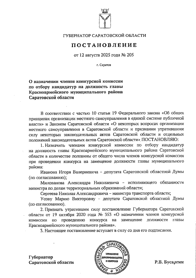 Постановление Губернатора Саратовской области от 12.08.2025 N 205 "О назначении членов конкурсной комиссии по отбору кандидатур на должность главы Красноармейского муниципального района Саратовской области"