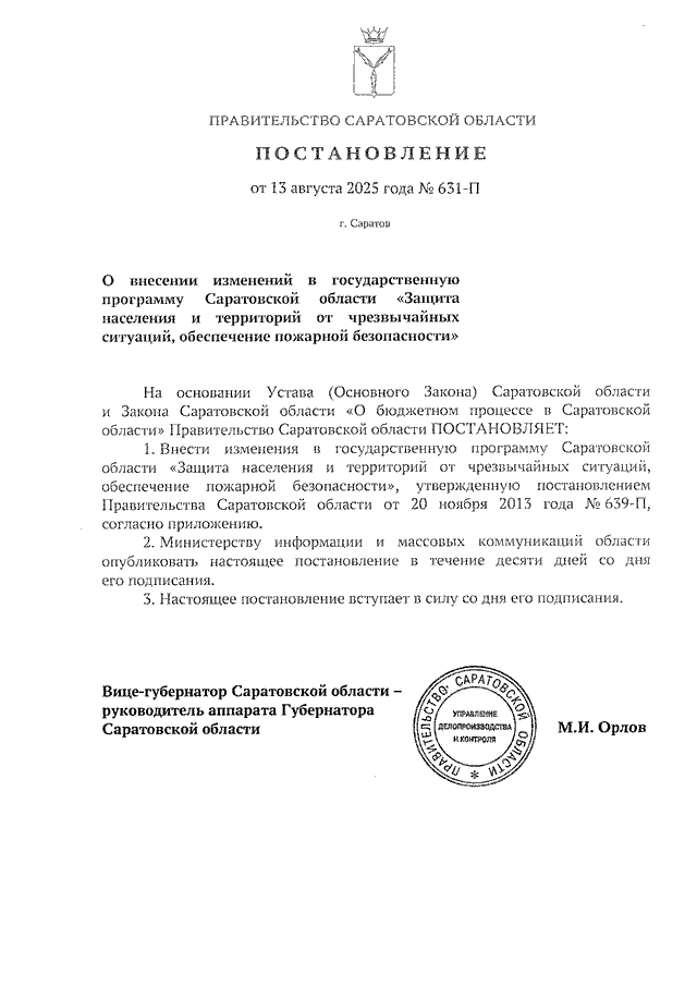 Постановление Правительства Саратовской области от 13.08.2025 N 631-П "О внесении изменений в государственную программу Саратовской области "Защита населения и территорий от чрезвычайных ситуаций, обеспечение пожарной безопасности"