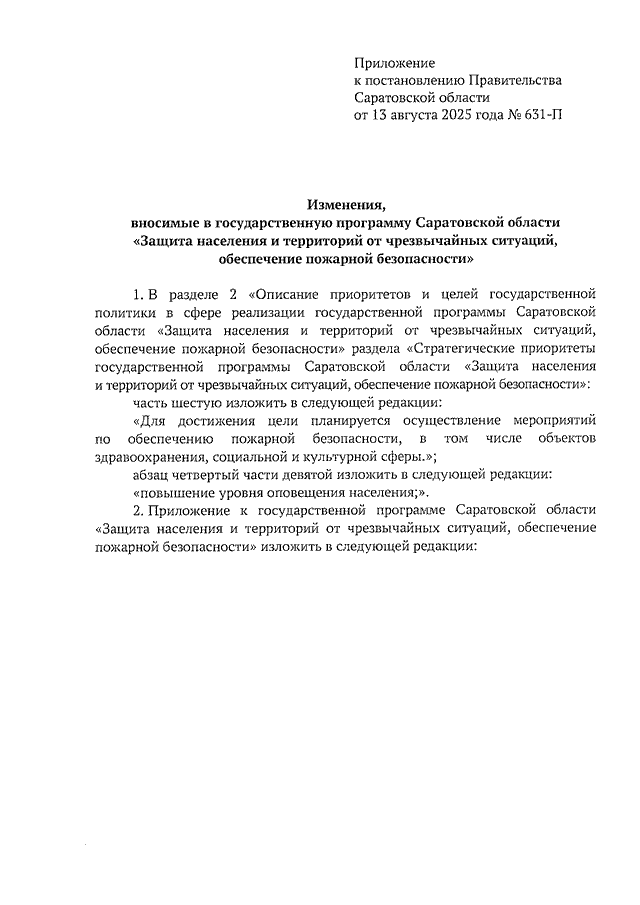 Постановление Правительства Саратовской области от 13.08.2025 N 631-П "О внесении изменений в государственную программу Саратовской области "Защита населения и территорий от чрезвычайных ситуаций, обеспечение пожарной безопасности"